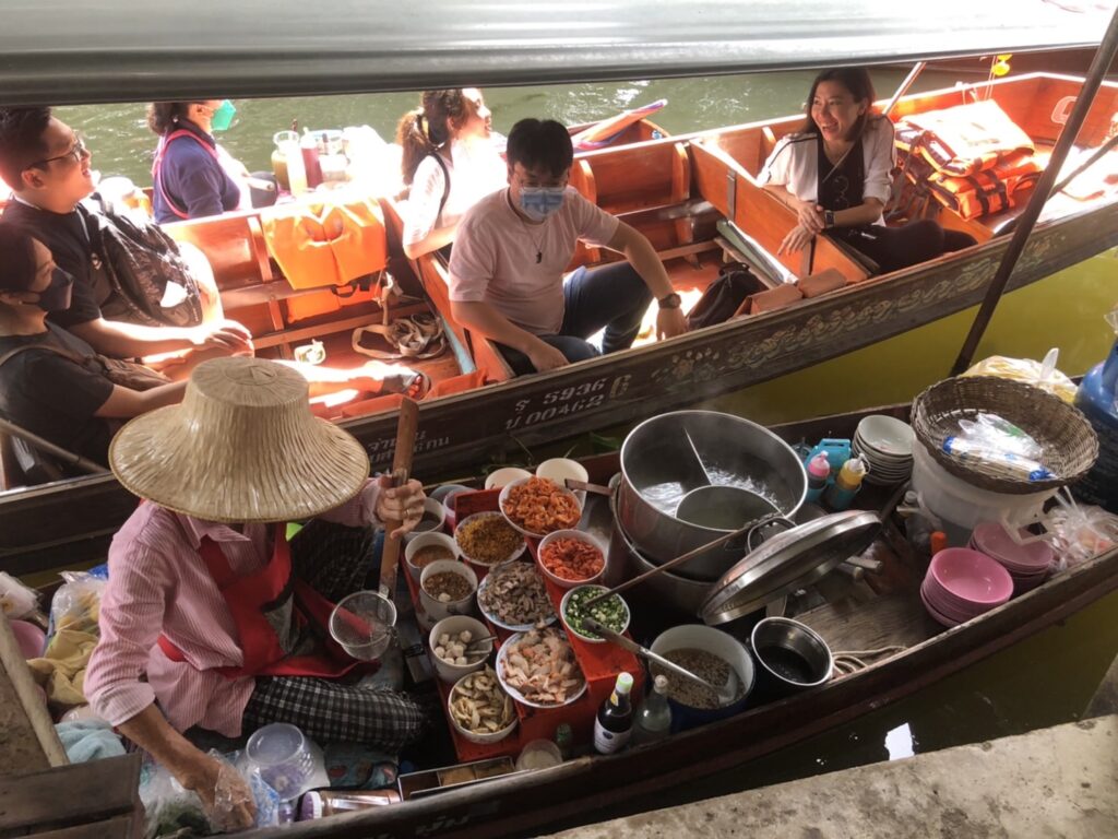 - You will take a ride in a paddle boat which is a great way to explore the floating market. Paddle boats are the ideal vehicle to navigate the busy waterways, allowing you to get a closer look at the colorful waterside market stalls and other passing boats and also engage with the traders. You will experience the dynamic atmosphere of the floating market with traders selling fruits, vegetables, foods, drinks, crafts and souvenirs from their boats and riverside stalls.